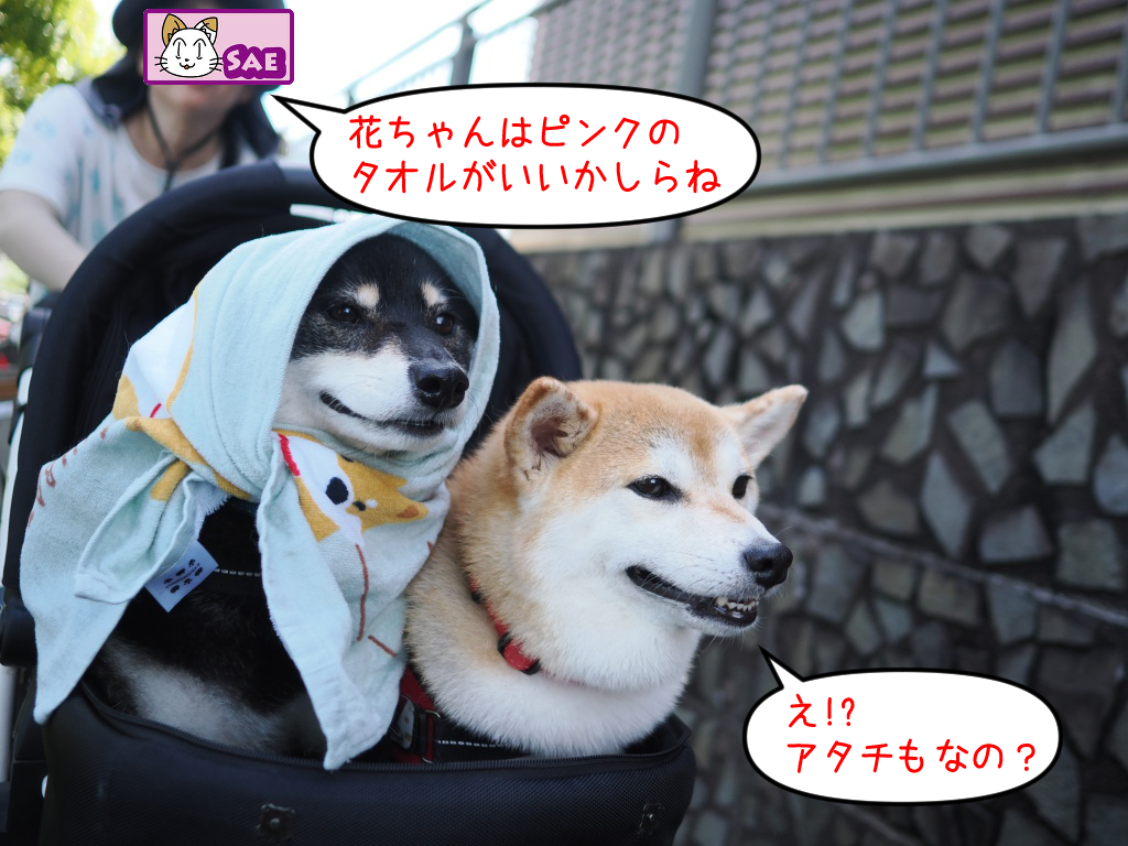 えー、前回のドッグランの後でオアシス刈谷に行った時に、暑さ防止で空丸にタオルを被せたのが、とても可愛くて気に入ったようです。
