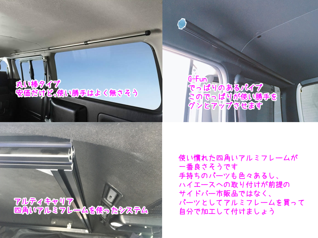 サイドバーとは、ハイエースの荷室の天井近く側面に取り付ける長いバーのことです。