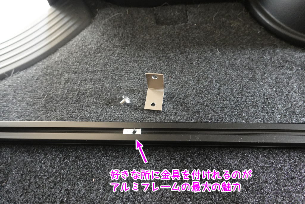アルミフレームに、専用のナットを入れて、仮の金具を取り付けます。