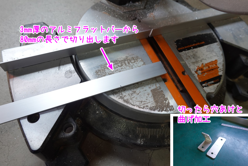 3mm厚のアルミフラットバーから切り出して、穴あけ曲げ加工をして、取り合えず2個作ります。