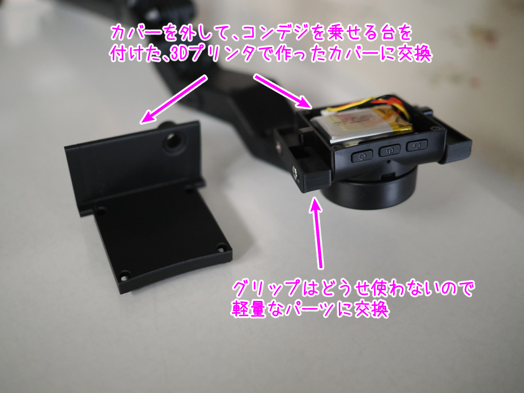 モーターやバッテリーが入っている部分のカバーを取り外してしまい、コンデジを乗せるためにL型の台を付けたカバーを3Dプリンタで作って交換します。