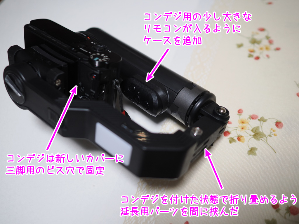コンデジを付けると厚みでちゃんと折り畳みが出来なくなるので、延長するためのパーツを間に入れました。