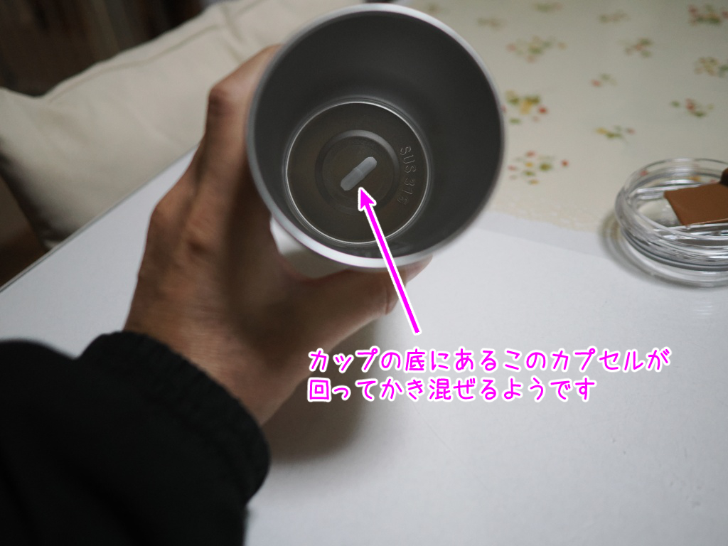 カップの中にマグネットのカプセルのような物が入っていて、カップの下部にあるモーターが回ると、カップの中のカプセルも磁石の力で一緒に回ります。