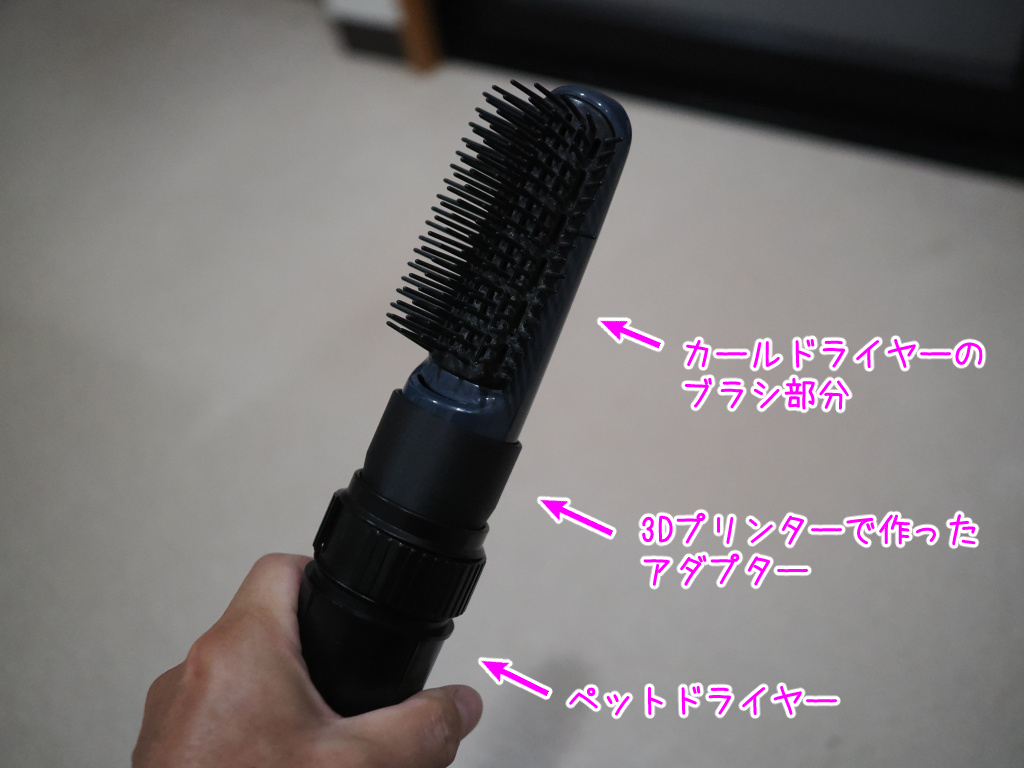 ドライヤーのパワーが弱くて使ってないのですが、これをペットドライヤーの先端に取り付けてみました。